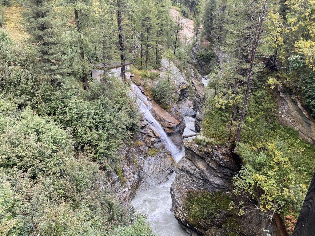 Das Martelltal ist bekannt dafür, dass Erdbeeren bis zu einer Höhe von 2000 müM bis Mitte November gedeihen. Nach weiteren 10 Minuten warten kommt der wesentlich kleinere Bus, der uns am Zufritttsee vorbei zum Alpengasthof Enzian auf knapp über 2000 müM bringt. Der Aufstieg zum See ist sehr steil und schmal viele enge Kehren daher der kleine Bus. Im Alpengasthof Enzian kehren wir erstmal ein. Da Mittagszeit ist vespern wir erst einmal. Als Nachtisch gibt es die Legendären Martelltal-Erdbeeren. Hier gönnen wir uns je ein T-Shirt mit Martelltal Aufdruck als Andenken. Natürlich dokumentieren wir diesen denkwürdigen Augenblich mit einem Foto. Jetzt wo wir frisch gestärkt sind, starten wir zu einer kleinen Wanderung. Leider zieht eine Wolke ins Tal und verliert Wasser. Nicht schön, aber nicht schlimm, denn wir sind nicht aus Zucker. Zuerst geht es bergauf bis zum Einstieg in die Plima-Schlucht. Hier in der sehr schönen Bergkulisse steht die Ruine von einem recht großen Hotel, schade für die Landschaft, dass müsste nicht sein. In der Schlucht geht es entlang vom Bach „Plima“ steil bergab von 2312müM auf 1880müM. Da es noch immer regnet ist es schlüpfrig und wir müssen sehr aufpassen, wo wir hintreten. Dank meiner Powersandalen bekomme ich keine nassen Socken. Da wir vorsichtig absteigen, benötigen wir viel Zeit und müssen unsere Planung anpassen. Ursprünglich wollten wir noch um den See herumlaufen. Sicherheitshalber, es ist der letzte Bus für diesen Tag, laufen jetzt nur bis zum See Anfang zur Haltestelle vor der Pension Zufritt. Schon nach kurzem warten kommt der Bus und bringt uns wieder Richtung Tal nach Gand. Von Gand geht es mit dem großen Bus bis Schlanders. Zum Glück regnet es nicht mehr und wir marschieren bergauf nach Kortsch, wo unser Hotel ist. Eigentlich wollten wir noch im Hotel eigenem Schwimmbad relaxen, doch zu Gunsten von einem Feierabend-Bier verzichten wir darauf. Wieder genießen wir unser Abend-Menü. Es gibt Vorspeise, Suppe, Hauptgericht und Nachtisch, dazu gönnen wir uns eine Flasche Wein. Wir nehmen uns noch eine Flasche mit aufs Zimmer und hören wieder Musik. Um 1:00 löschen wir wieder das Licht. Das war ein schöner Pausetag.